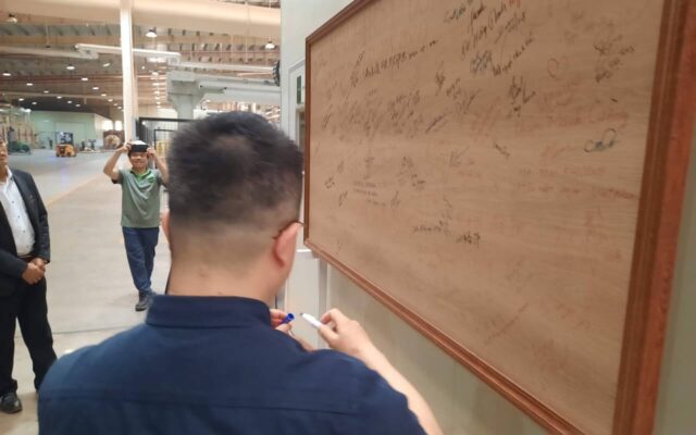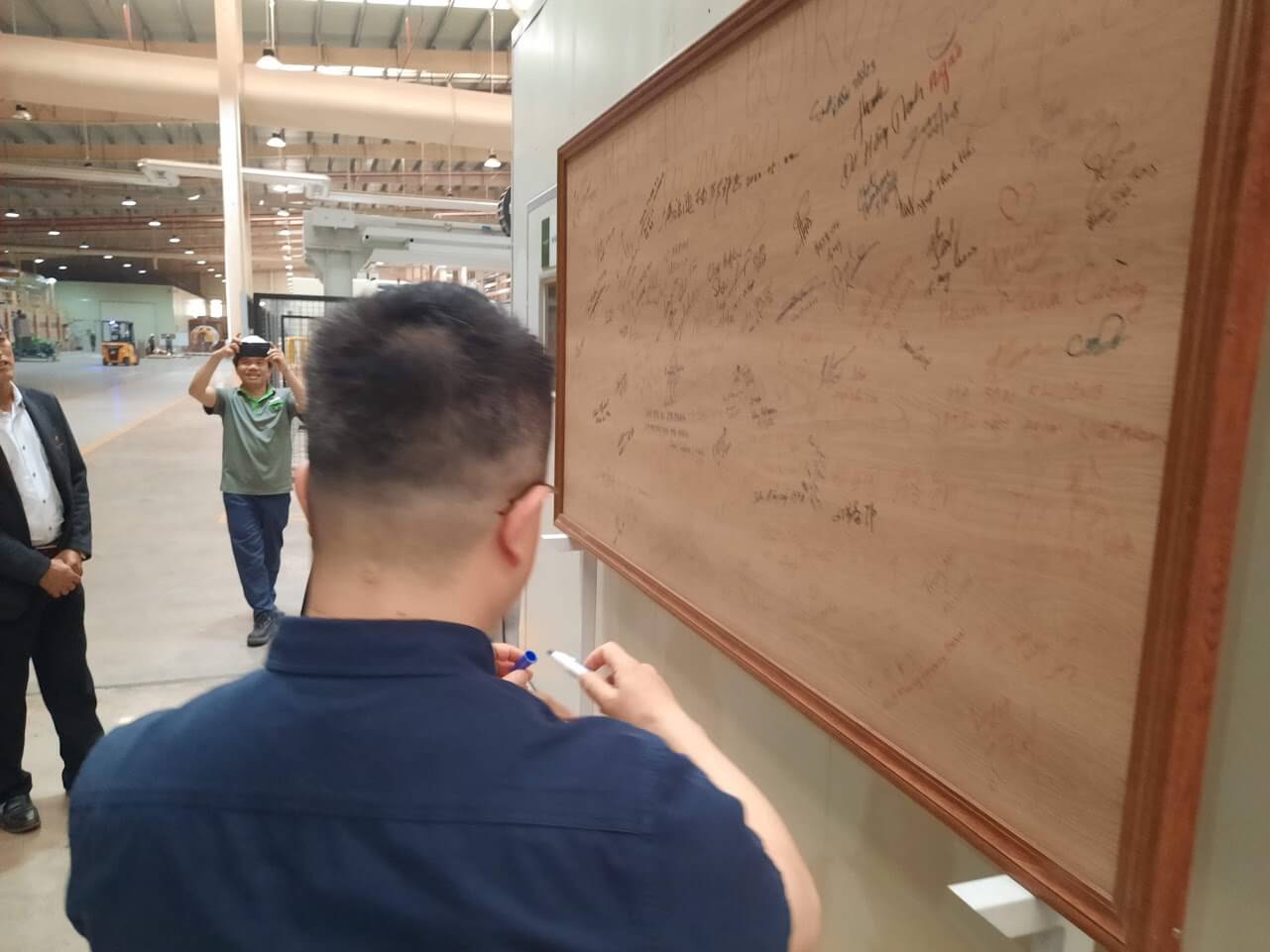 Kết thúc chuyến tham quan, đoàn công tác đã ký tên lên tấm MDF đầu tiên được nhà máy sản xuất, đánh dấu một cột mốc mới cho sự phát triển hợp tác lâu dài và chặt chẽ giữa các bên.